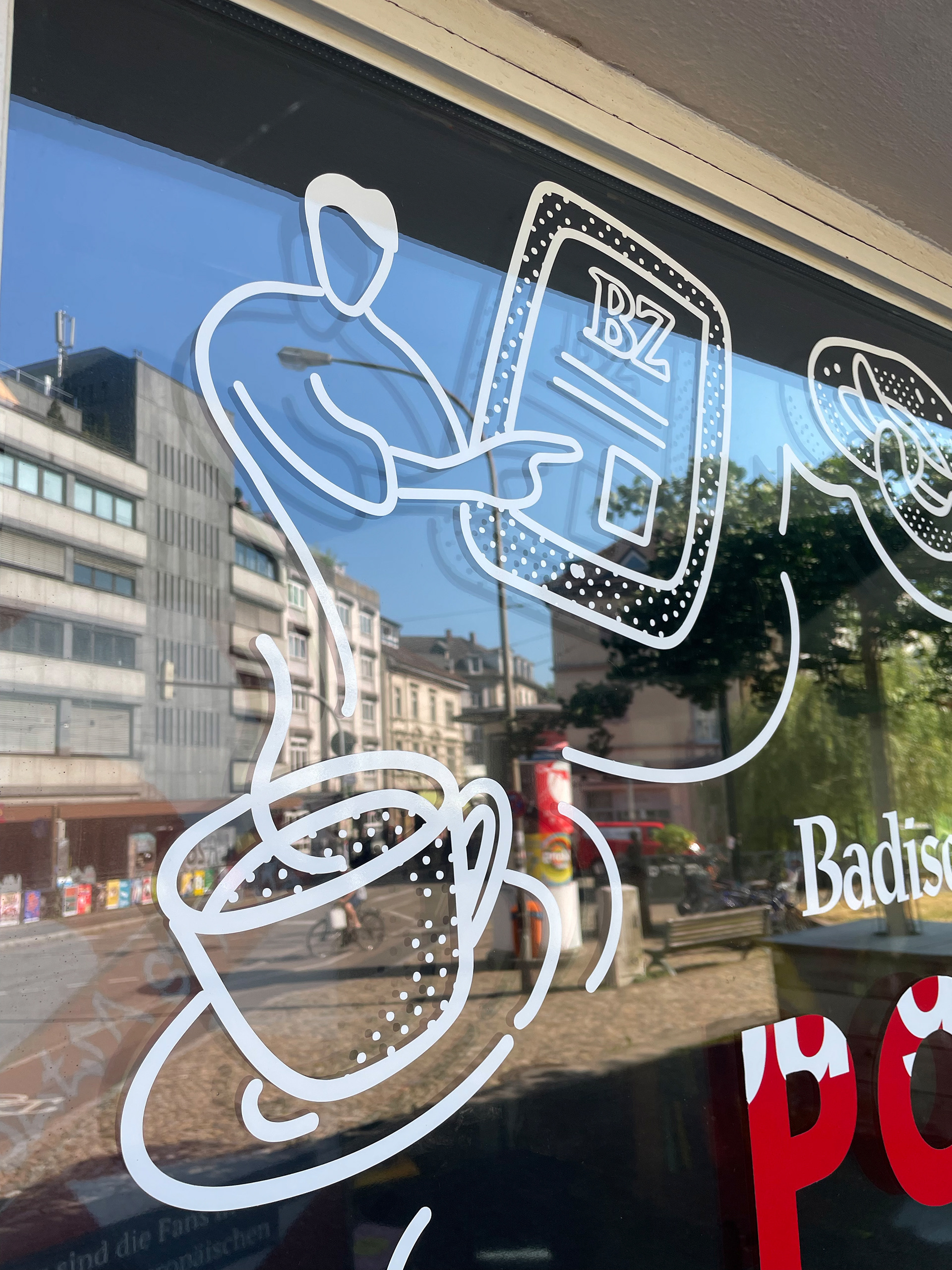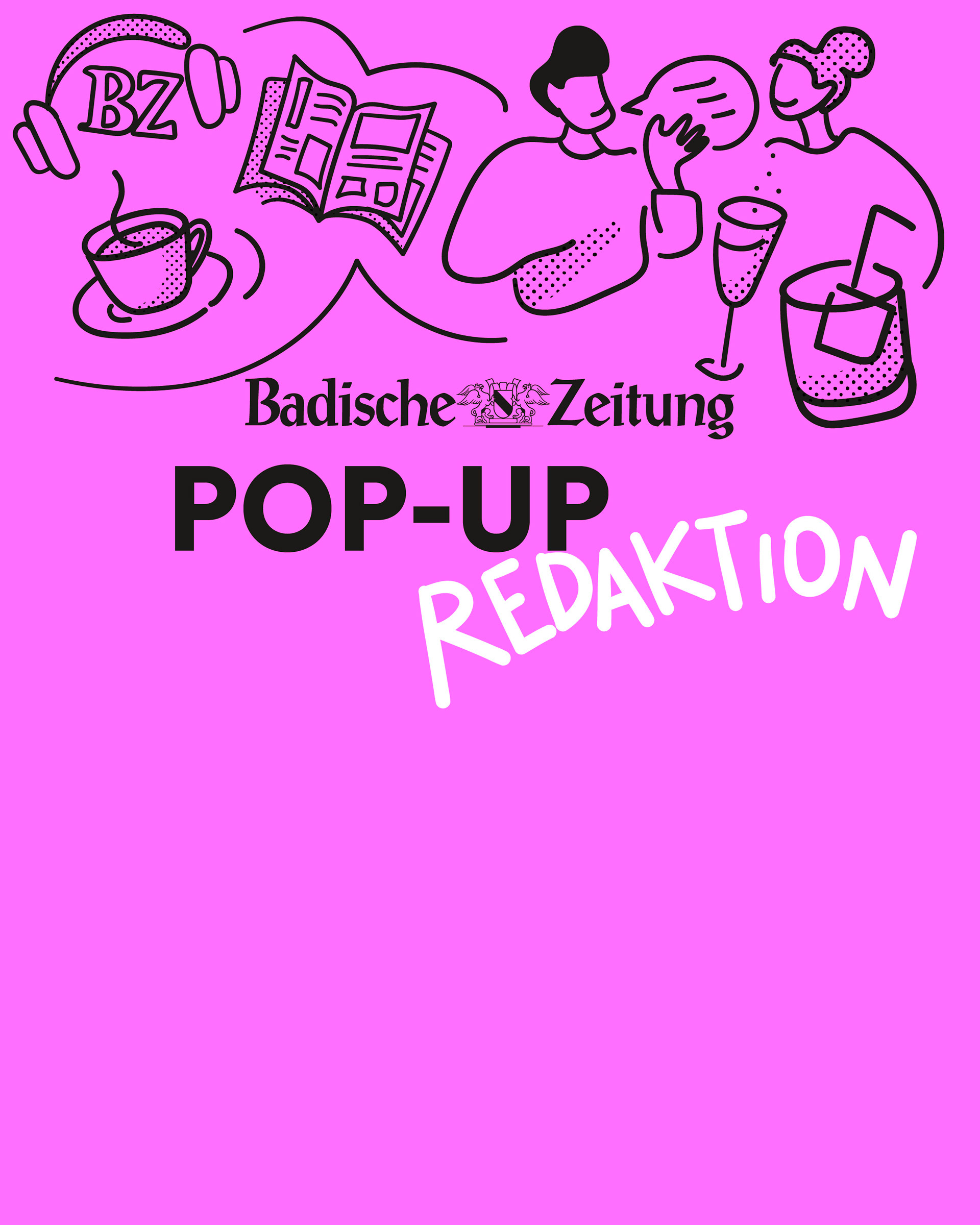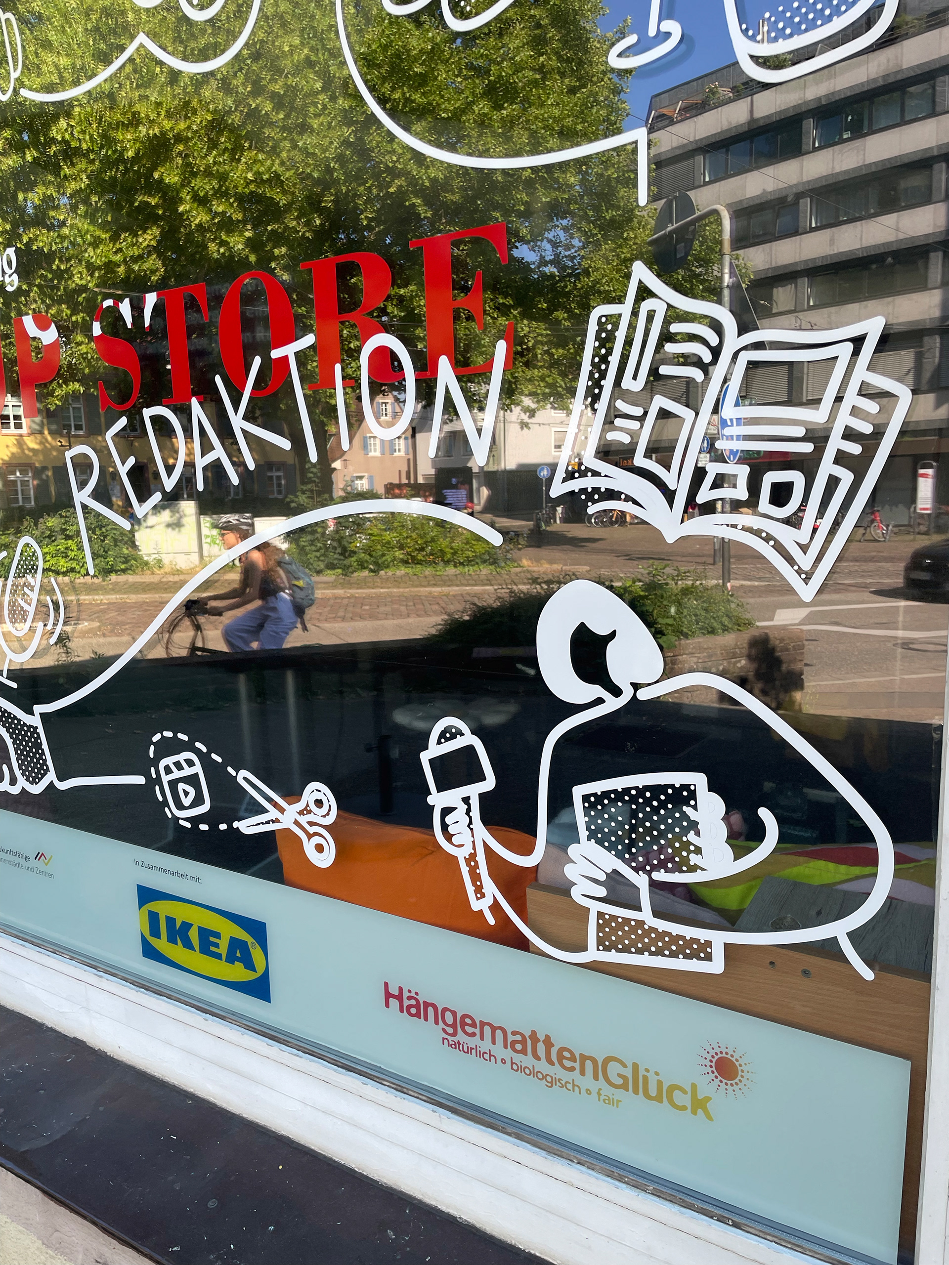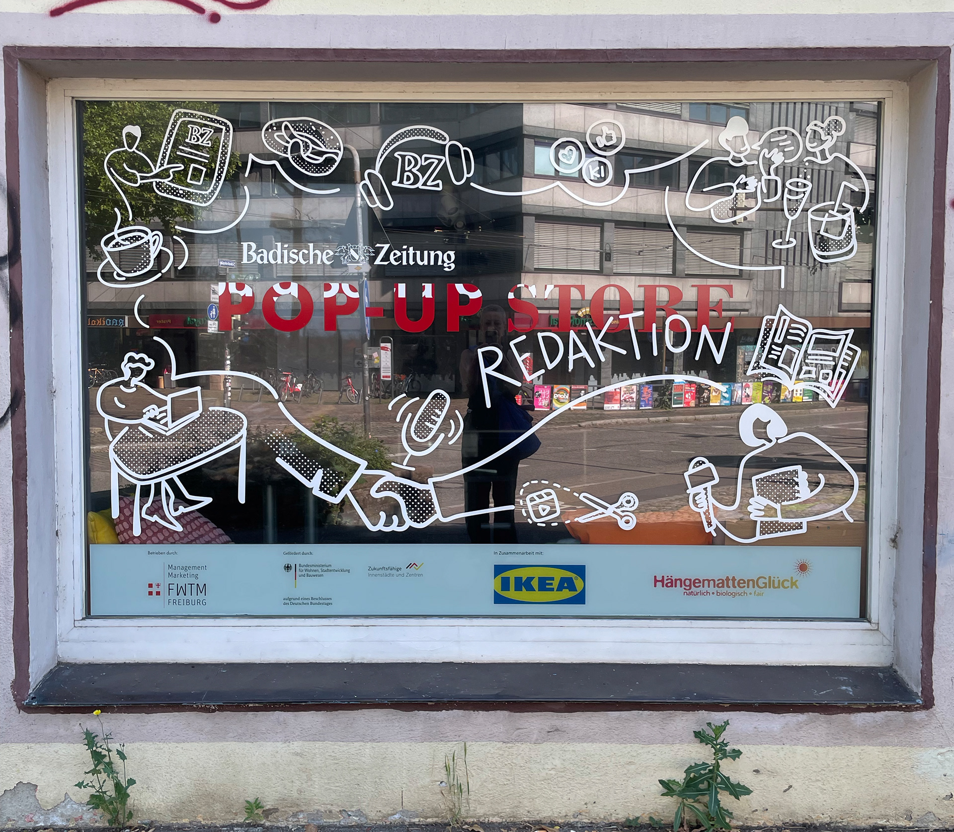 Im März 2025 startete die FWTM ein Zwischennutzungsprojekt als POP-UP in einem ehemaligen Antiquitätengeschäft am Schwabentorplatz. Ab dem 30. Juni übernahm die Badische Zeitung die Räumlichkeiten für zwei Wochen als POP-UP Redaktion mit einem vielfältigen Programm. Ich durfte die Illustration mit Schaufenstergestaltung übernehmen.