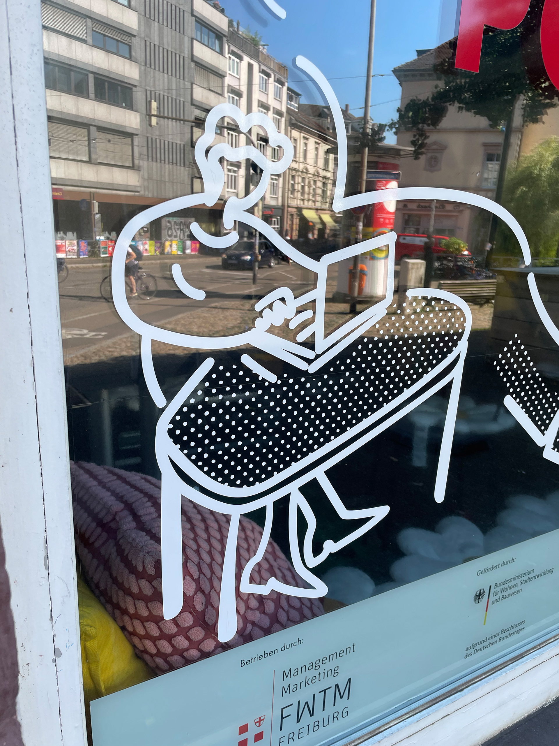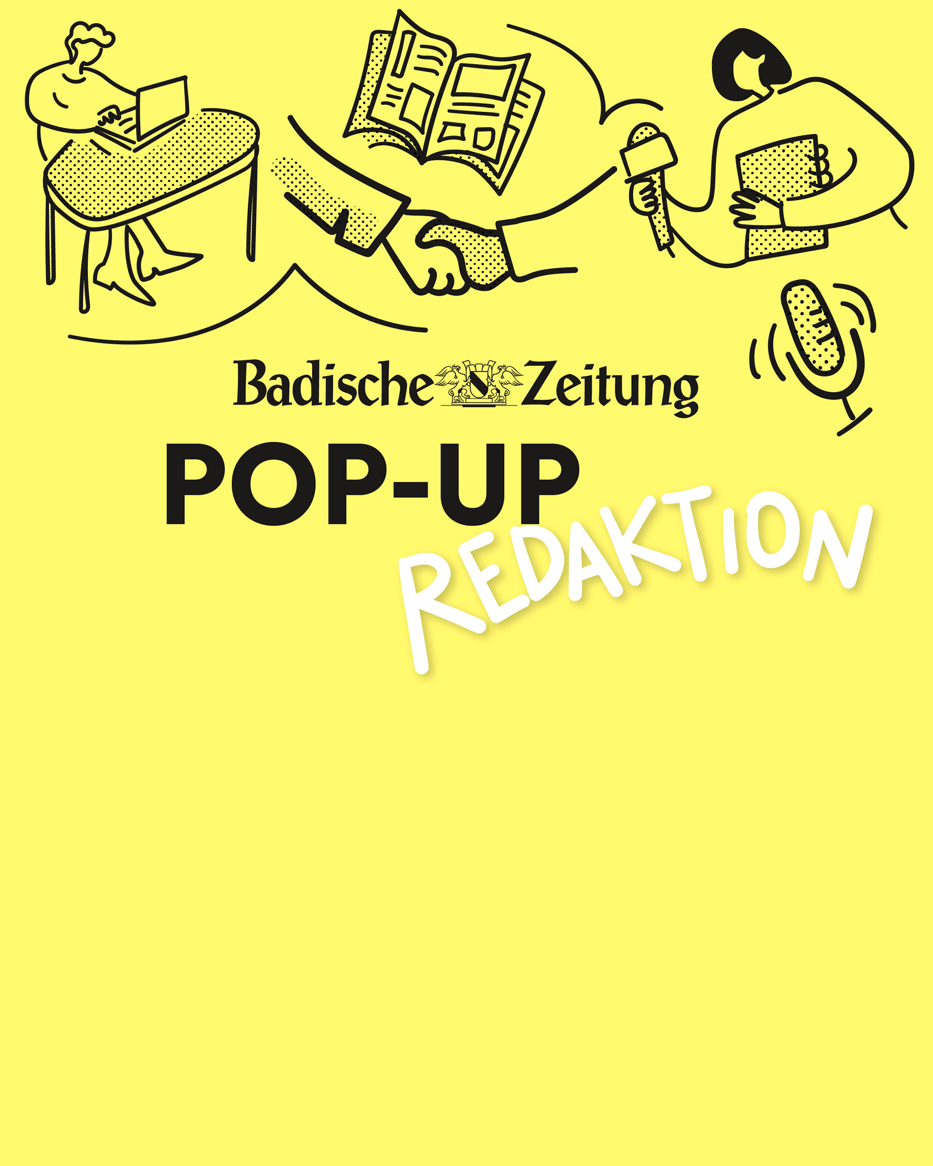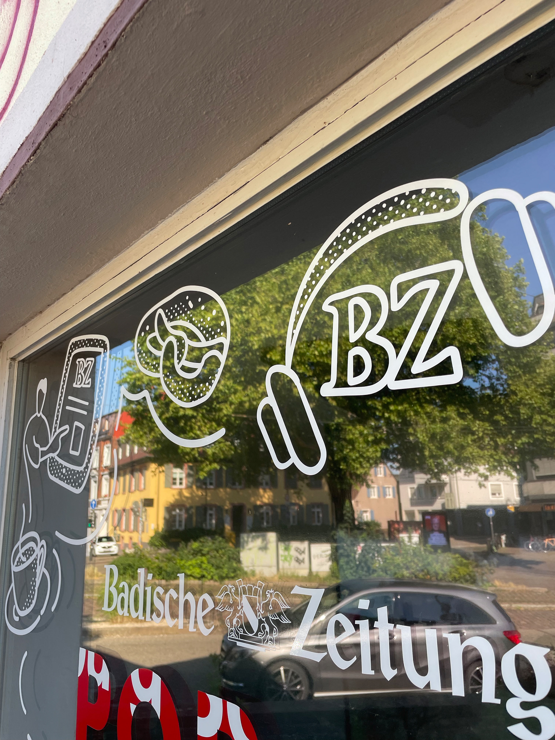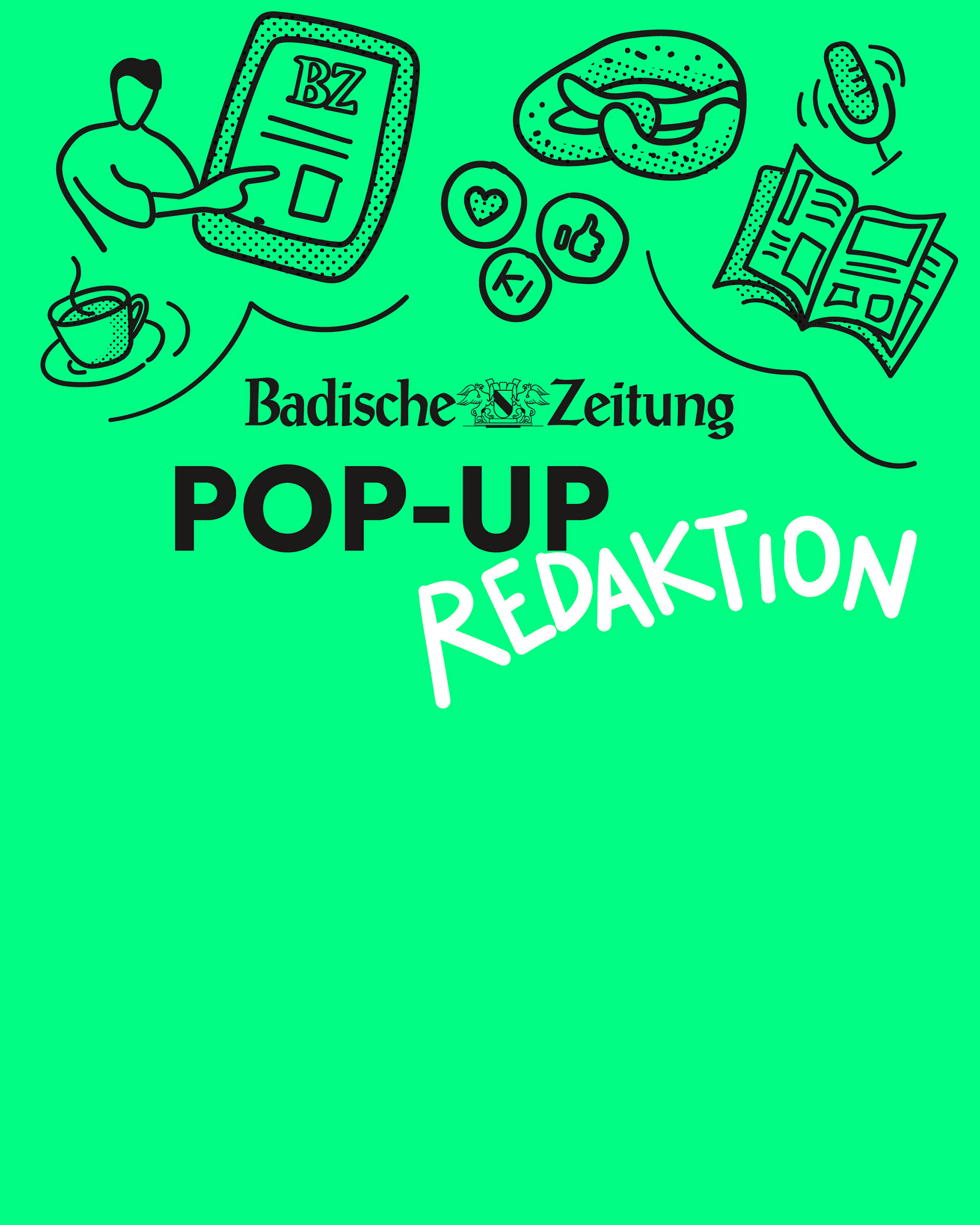 Im März 2025 startete die FWTM ein Zwischennutzungsprojekt als POP-UP in einem ehemaligen Antiquitätengeschäft am Schwabentorplatz. Ab dem 30. Juni übernahm die Badische Zeitung die Räumlichkeiten für zwei Wochen als POP-UP Redaktion mit einem vielfältigen Programm. Ich durfte die Illustration mit Schaufenstergestaltung übernehmen.