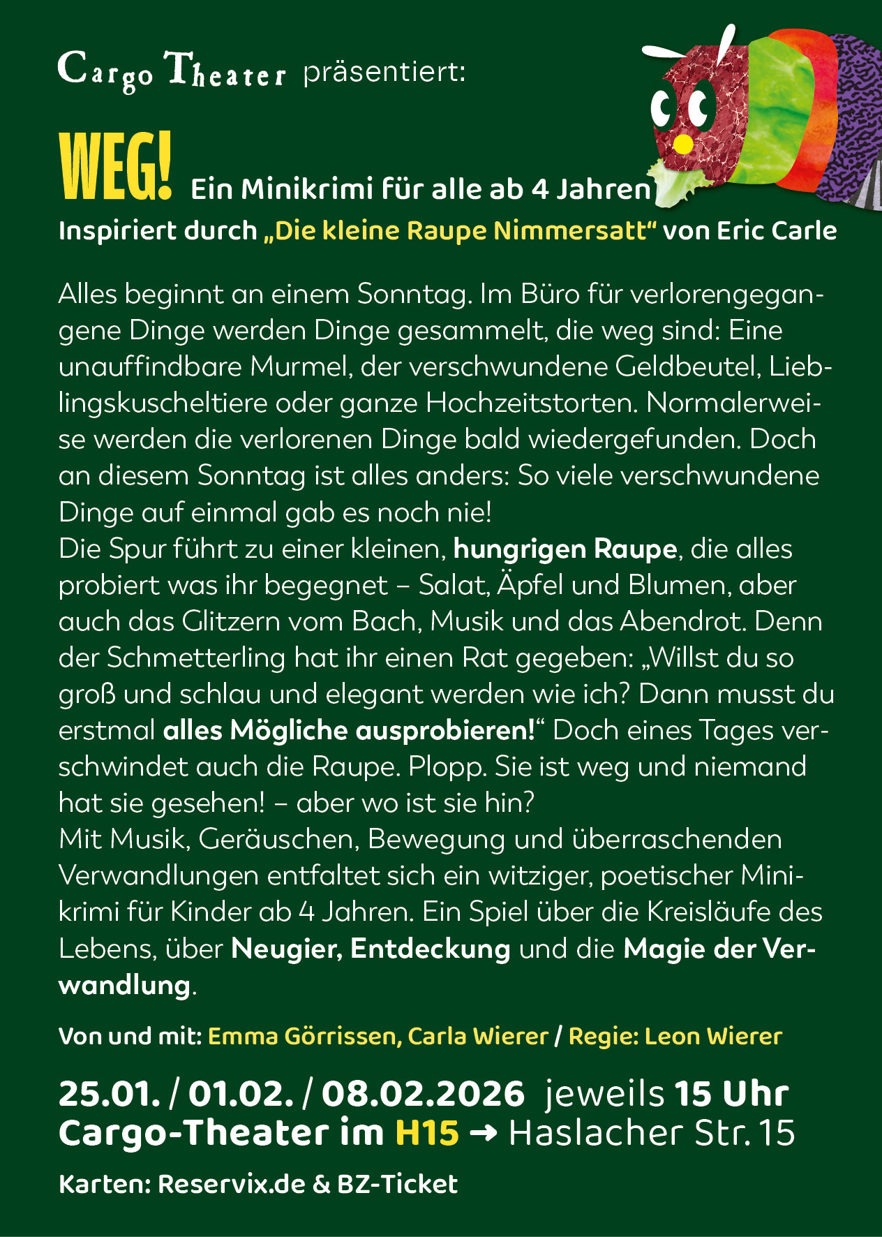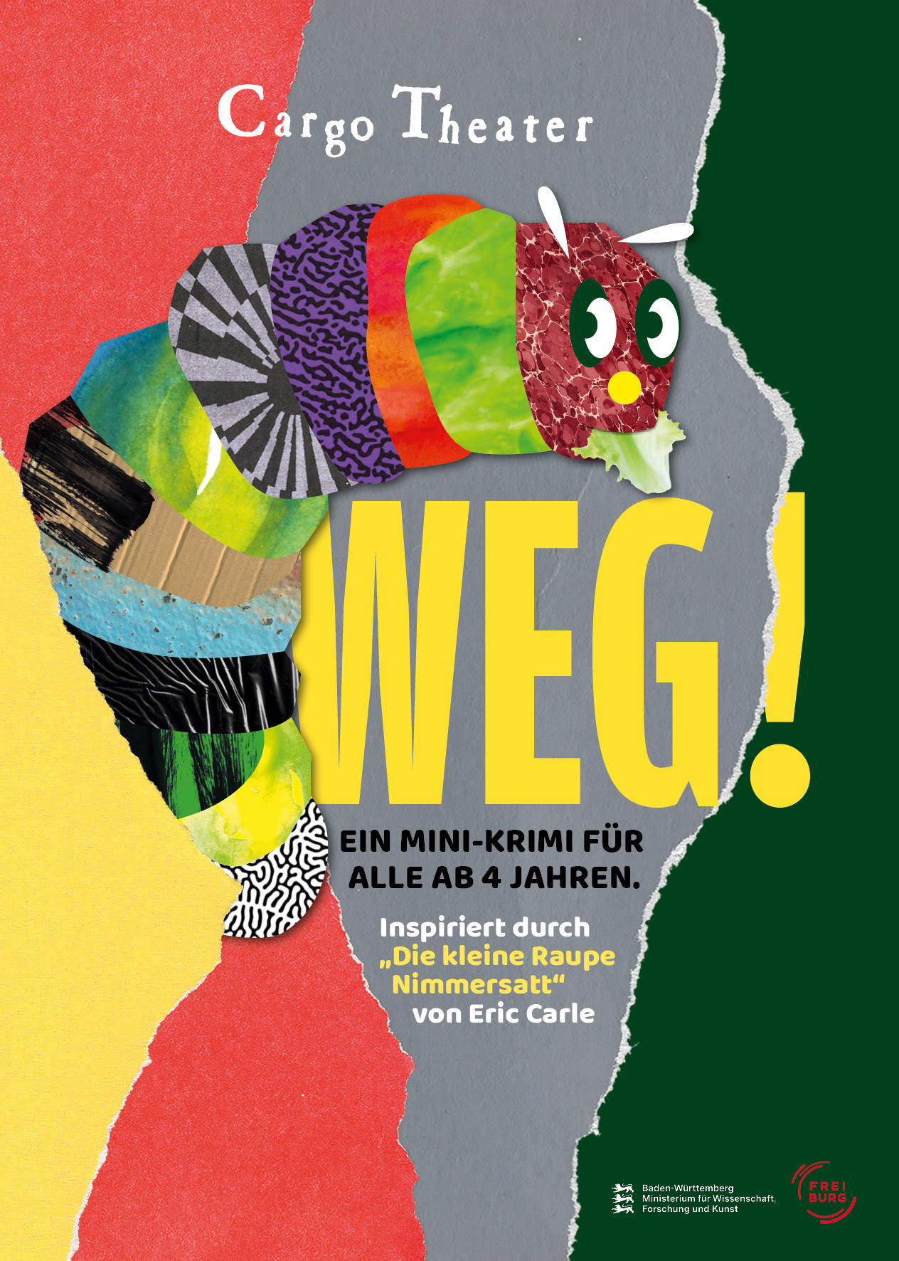 Für das Cargo Theater Freiburg habe ich ein Plakat zum Stück »WEG! – Inspiriert durch „Die kleine Raupe